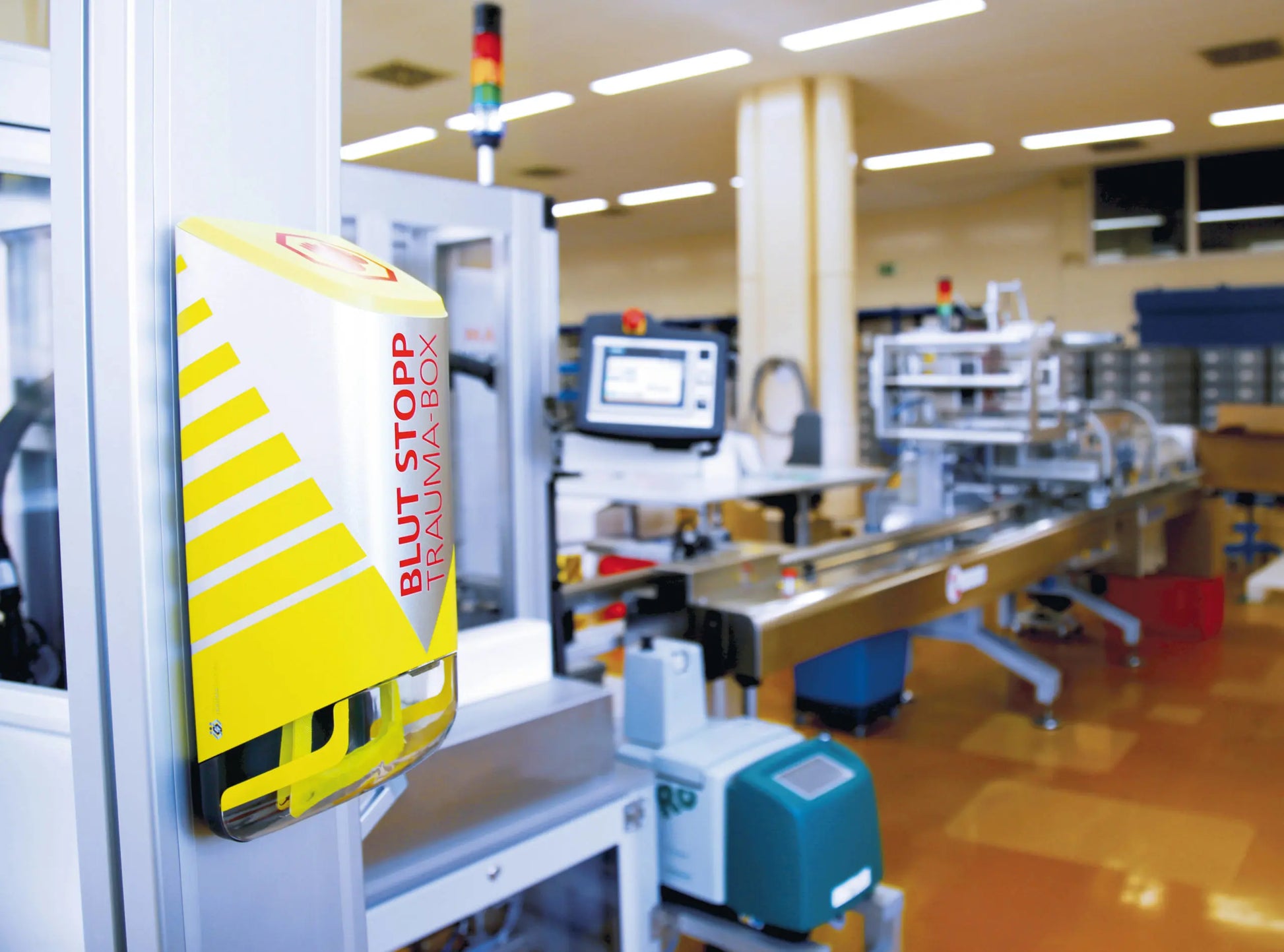 Hartmann Trauma Box är ett första hjälpen-kit för akut hemostas vid kraftigt blödande sår. Behållaren består av två sektioner: